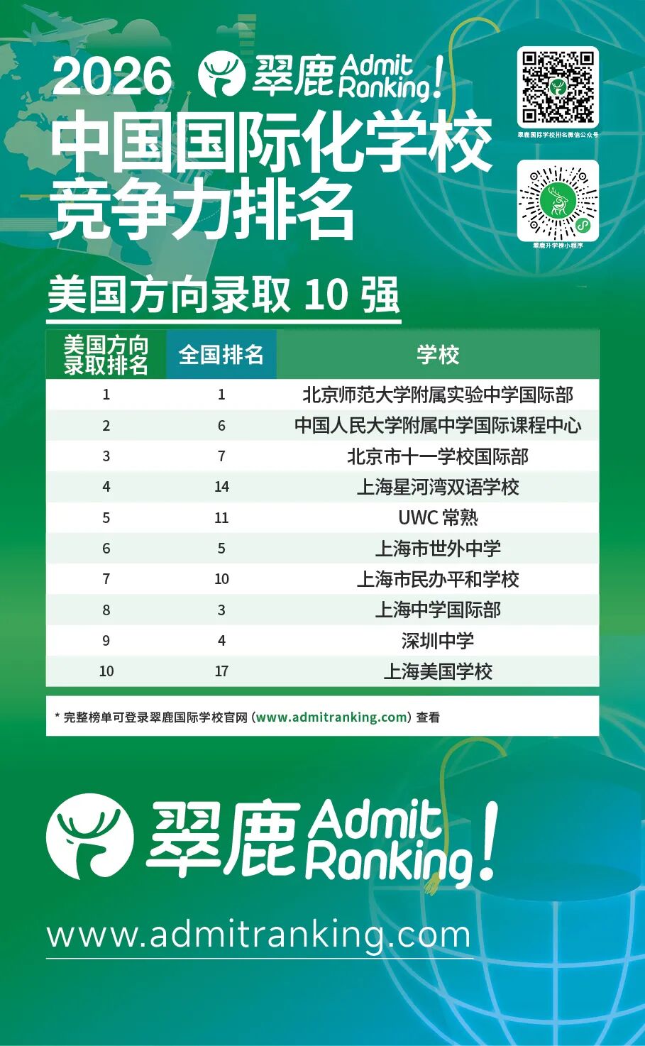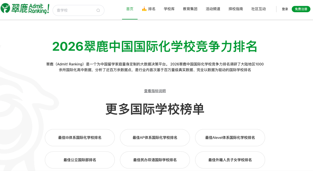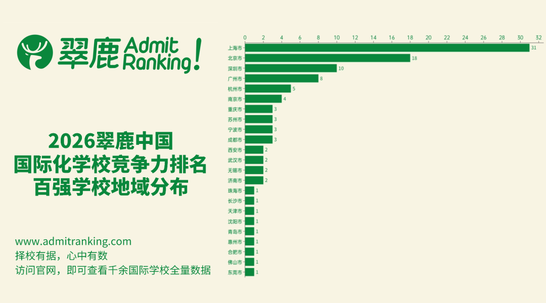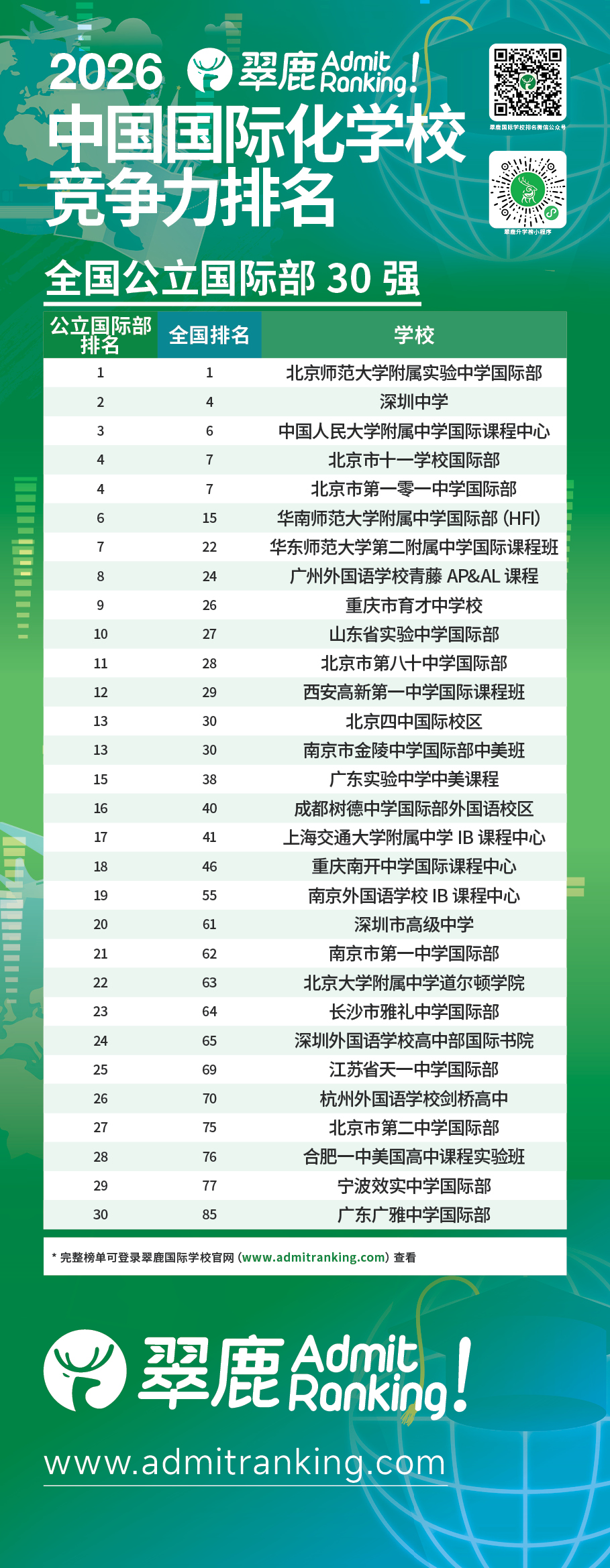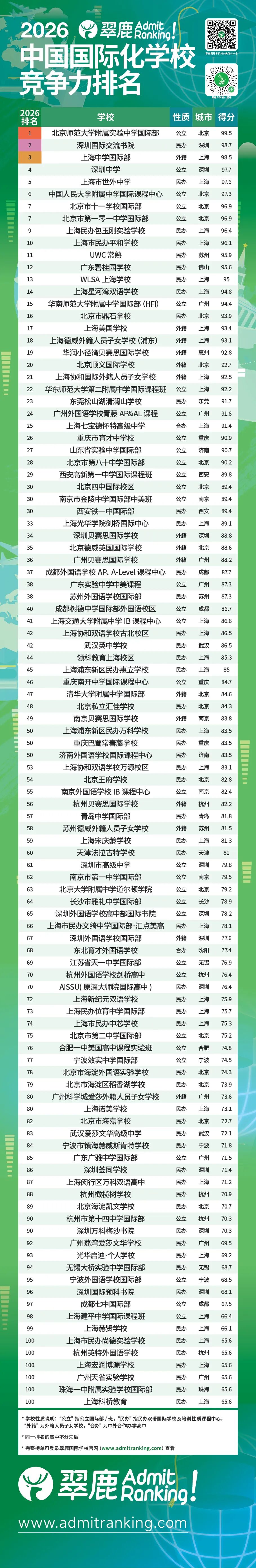 翠鹿(Admit! Ranking)是一个为中国留学家庭量身定制的大数据决策平台 2026翠鹿中国国际化学校竞争力排名调研了大陆地区1000余所国际化高中数据,分析了百万余数据点,是行业内首次基于百万量级真实数据、完全以数据为驱动的国际学校排名 23个省份及直辖市、40个城市的300所学校上榜 上海是上榜学校最多的城市,300强中有60所学校位于上海,100强中有31所学校位于上海。北京是上榜第二多的城市,深圳其次 北师大实验国际部荣登榜首,深国交是排名最高的民办学校,上海中学国际部位列上海首席 北京、上海各有四所学校跻身十强,广深地区两所学校跻身十强 百强学校中,民办双语国际学校占据半壁江山,公立国际部34所,外籍国际学校15所,中外合作办学高中2所 AP及美高课程为主流,越来越多的学校开设多元化课程体系 国际教育越来越注重低龄培养,百强学校中共有47所十二年一贯制学校 百强学校中,学术强校云集,平均SAT成绩为1465,平均托福成绩为100,AP 平均分为4.1,IB平均分为36 百强高中获得了全国国际化学校近90%的藤校及美国综合前十大学录取,近70%的牛津剑桥录取
