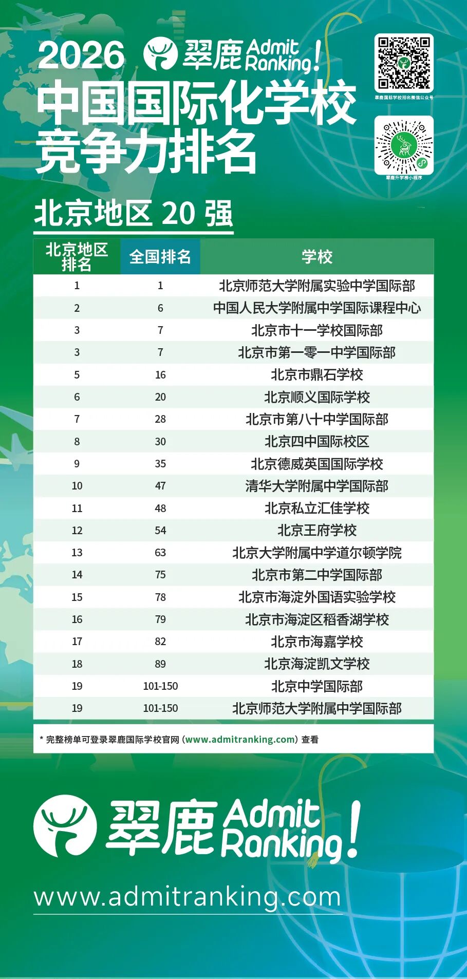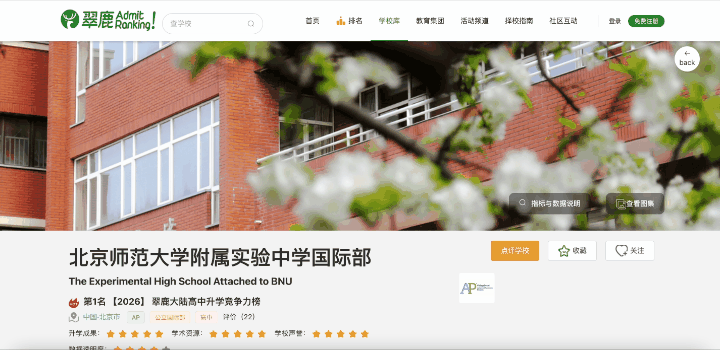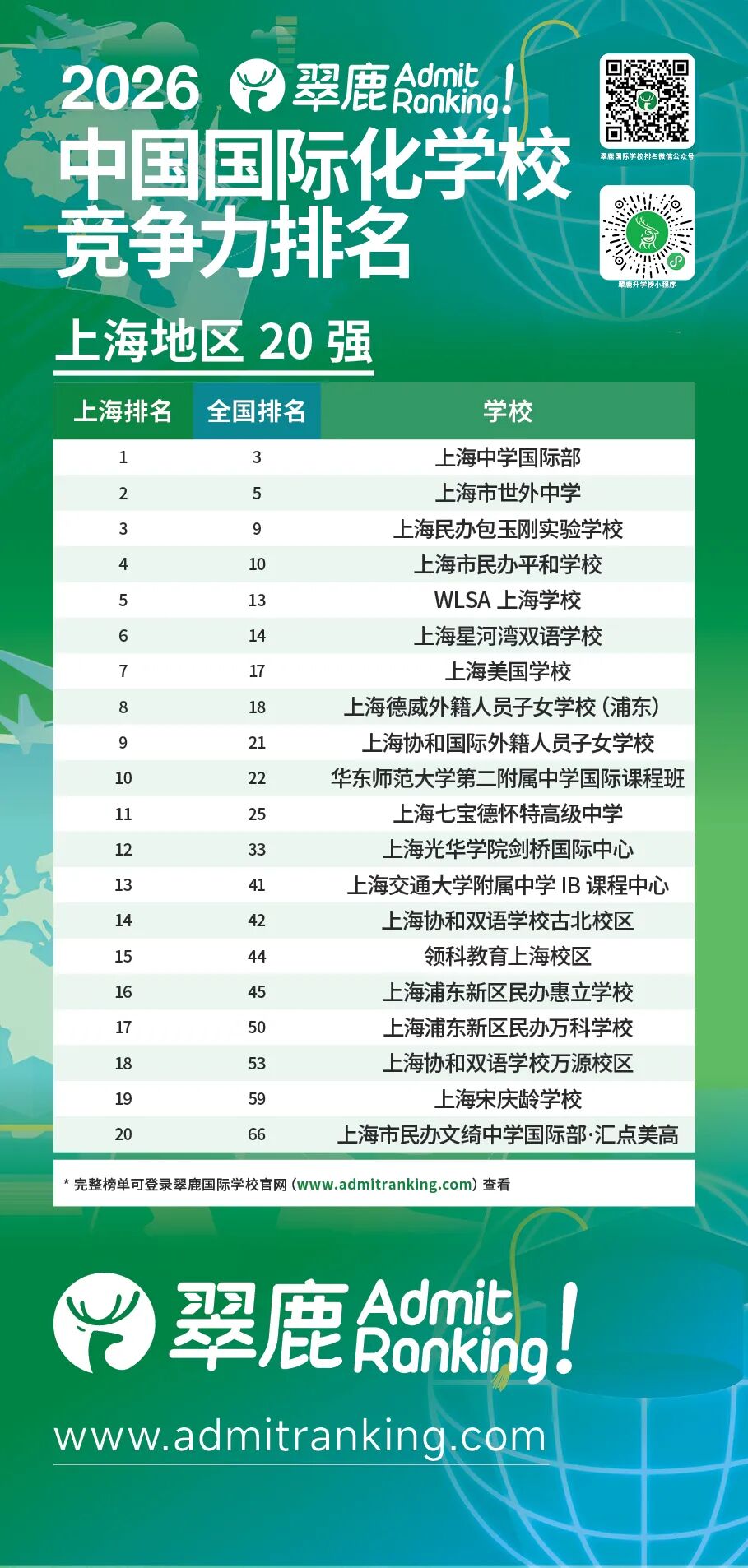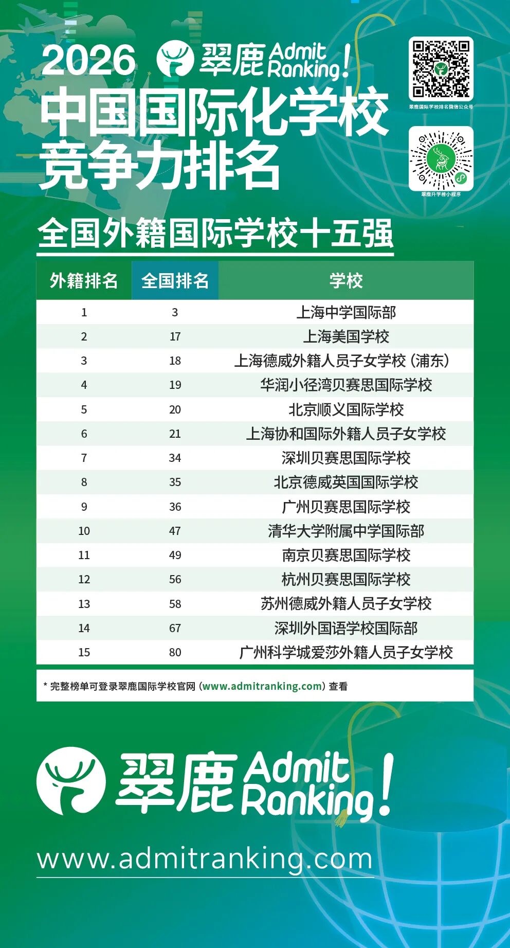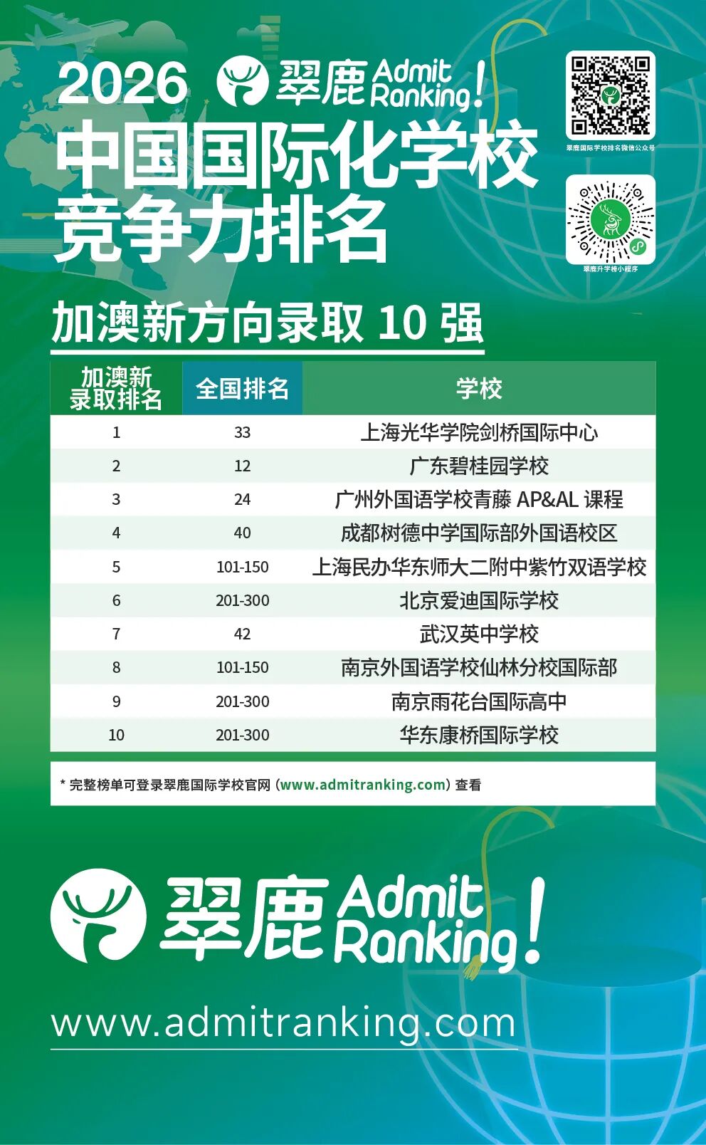 翠鹿(Admit! Ranking)是一个为中国留学家庭量身定制的大数据决策平台 2026翠鹿中国国际化学校竞争力排名调研了大陆地区1000余所国际化高中数据,分析了百万余数据点,是行业内首次基于百万量级真实数据、完全以数据为驱动的国际学校排名 23个省份及直辖市、40个城市的300所学校上榜 上海是上榜学校最多的城市,300强中有60所学校位于上海,100强中有31所学校位于上海。北京是上榜第二多的城市,深圳其次 北师大实验国际部荣登榜首,深国交是排名最高的民办学校,上海中学国际部位列上海首席 北京、上海各有四所学校跻身十强,广深地区两所学校跻身十强 百强学校中,民办双语国际学校占据半壁江山,公立国际部34所,外籍国际学校15所,中外合作办学高中2所 AP及美高课程为主流,越来越多的学校开设多元化课程体系 国际教育越来越注重低龄培养,百强学校中共有47所十二年一贯制学校 百强学校中,学术强校云集,平均SAT成绩为1465,平均托福成绩为100,AP 平均分为4.1,IB平均分为36 百强高中获得了全国国际化学校近90%的藤校及美国综合前十大学录取,近70%的牛津剑桥录取