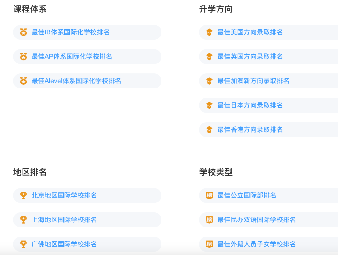 在翠鹿数据库上,可以直接查看总榜单,一览全国百强学校的综合排名,快速锁定第一梯队的顶尖名校,也可以查看丰富的细分榜单 ,无论是美国、英国、加澳日新港等热门留学目的地榜,或者是华北、江浙沪、广深、西北、川渝等地区的区域榜,抑或是IB、AP、Alevel、DSE、OSSD、日本课程,均能够一键查询,快速检索。