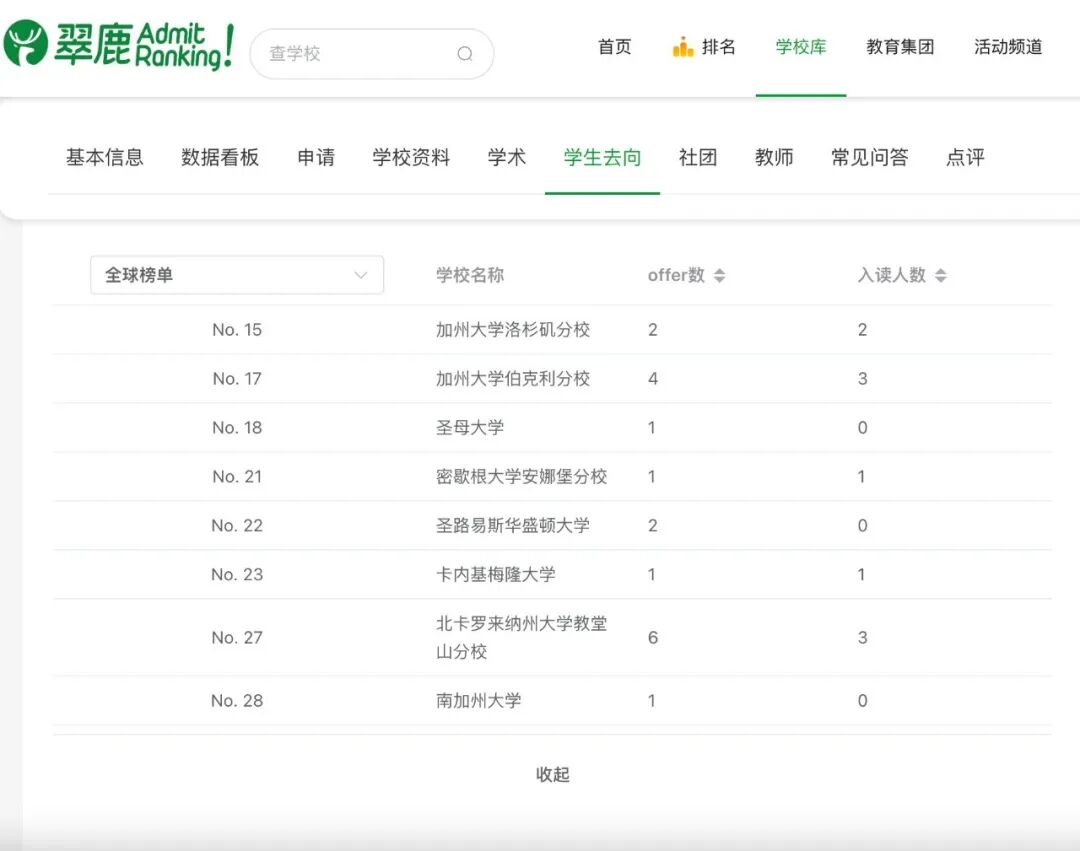 翠鹿旗下产品翠鹿升学榜自2018年起,系统性地收集分析中国学生获得全球顶尖名校的录取offer,至今已积累9个申请季、近40万条的录取数据。在此基础上,翠鹿国际学校数据库更新增了学生的入读信息,方便留学家庭了解学校毕业生的实际最终去向,从而了解国际学校的整体实力。