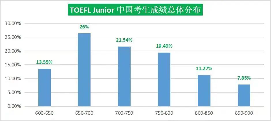 小托福和托福的出题方都是美国ETS,所以在测评方向上都是国际标准,小托福和整个托福体系课程的学习就是一个循环渐进的过程。系统学习过小托福或者参加过小托福考试的学生,能够更加顺利地衔接托福雅思SAT和其他标准化语言能力考试。而这种衔接方式有两点主要表现。较大托福而言,小托福题型考查范围小一些,内容更简单一些,可以理解为向大托福的过渡。在完善地学习小托福之后,可以更为顺利地衔接大托福的学习和测试。通过小托福成绩可以预估托福的分数。例如,830-900分的小托福成绩可以预估托福87-109分,雅思5.5-6.5分,CEFR为B2级别。▲CEFR即欧洲语言共同框架,IELTS即雅思,PTE即培生英语考试,TOEIC即托业参加TOEFL Junior的考生将在考试结束后收到一份成绩报告。报告中包含一个总分成绩(TOEFL Junior为600-900)和相应的分数段,让学生了解自己成绩所达到的区间水平。同样地,这个区间也能区别于其它系列考试,以防考生混淆。接着,考生可以知道自己在三个测试模块分别的得分情况以及对应的CEFR,方便学生在欧标体系中去定位自己的语言能力。但是CEFR只能提供一个宽泛的能力定位,因此TOEFL Junior在成绩报告中针对各部分成绩提供了更详尽的能力描述,帮助考生了解自己的优劣势所在。从数据可以看出,小托福800+以上的成绩大概占据20%人数,相当于每5个小朋友中就有一位是800+。由于小托福是英语能力的综合证明,所以体制内的学生也会参加,压力给到想要就读国际学校的学生,有竞争力的分数需要考到前10%。如果想让孩子走出国这条路,接受国际教育,小托福是一个最好的让孩子提前适应标化考试的测评标准,也是从国际化视野的角度来衡量孩子英文水平的最合适的测试。