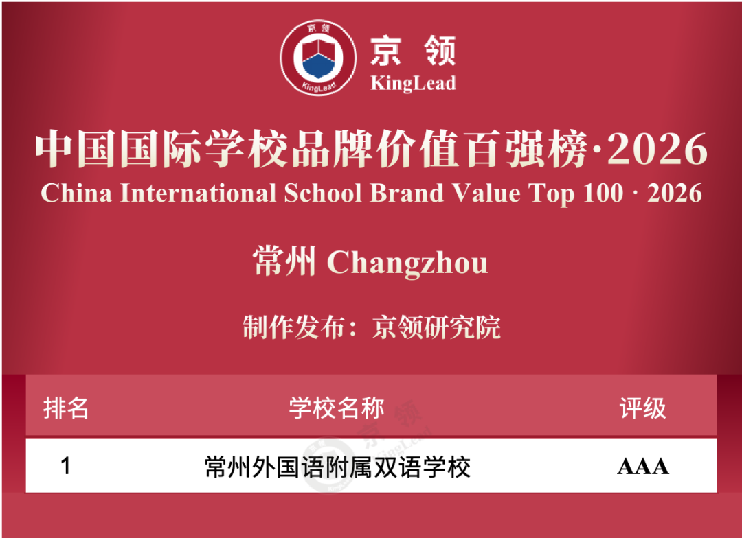 常州市共有1所国际学校上榜,荣获3A评级,为常州外国语附属双语学校。
