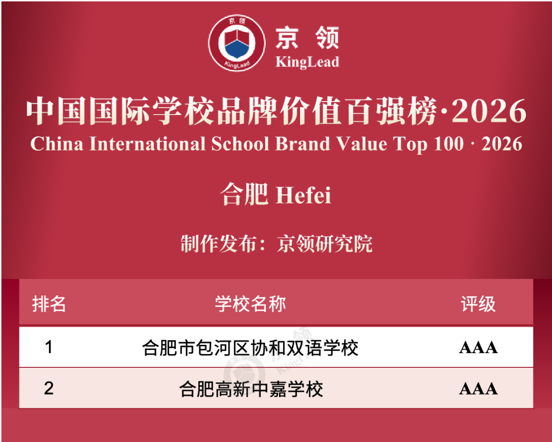 合肥市共有2所国际学校上榜,均荣获3A评级,分别为合肥市包河区协和双语学校、合肥高新中嘉学校。