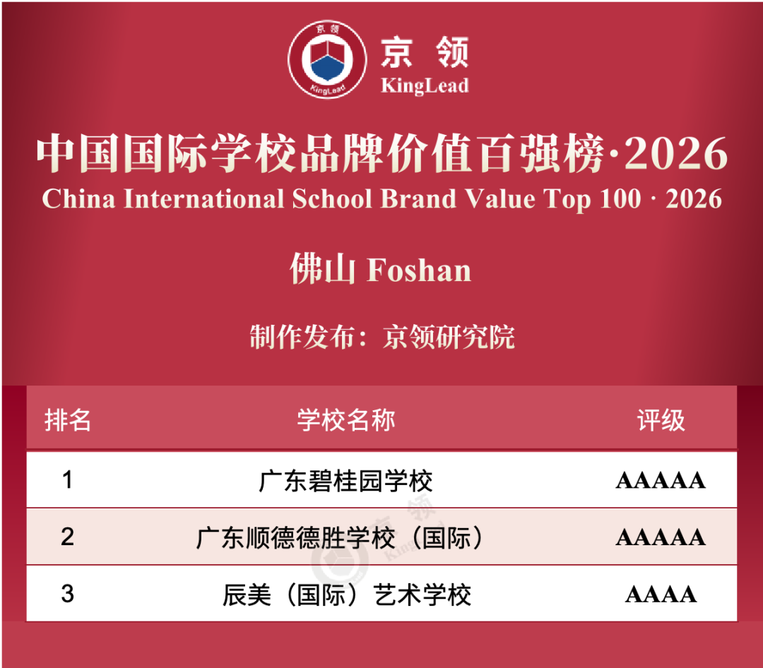 佛山市共有3所国际学校上榜。其中2所学校荣获5A评级,分别为广东碧桂园学校、广东顺德德胜学校(国际)。1所荣获3A评级,为辰美(国际)艺术学校。