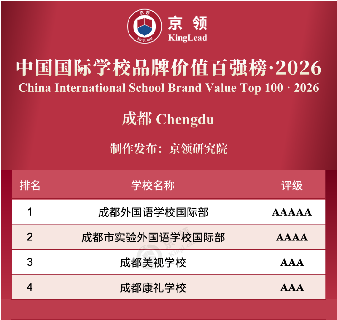 成都市共有4所国际学校上榜。其中1所学校荣获5A评级,为成都外国语学校国际部。1所学校荣获4A评级,为成都市实验外国语学校国际部。2所学校荣获3A评级,分别为成都美视学校、成都康礼学校。