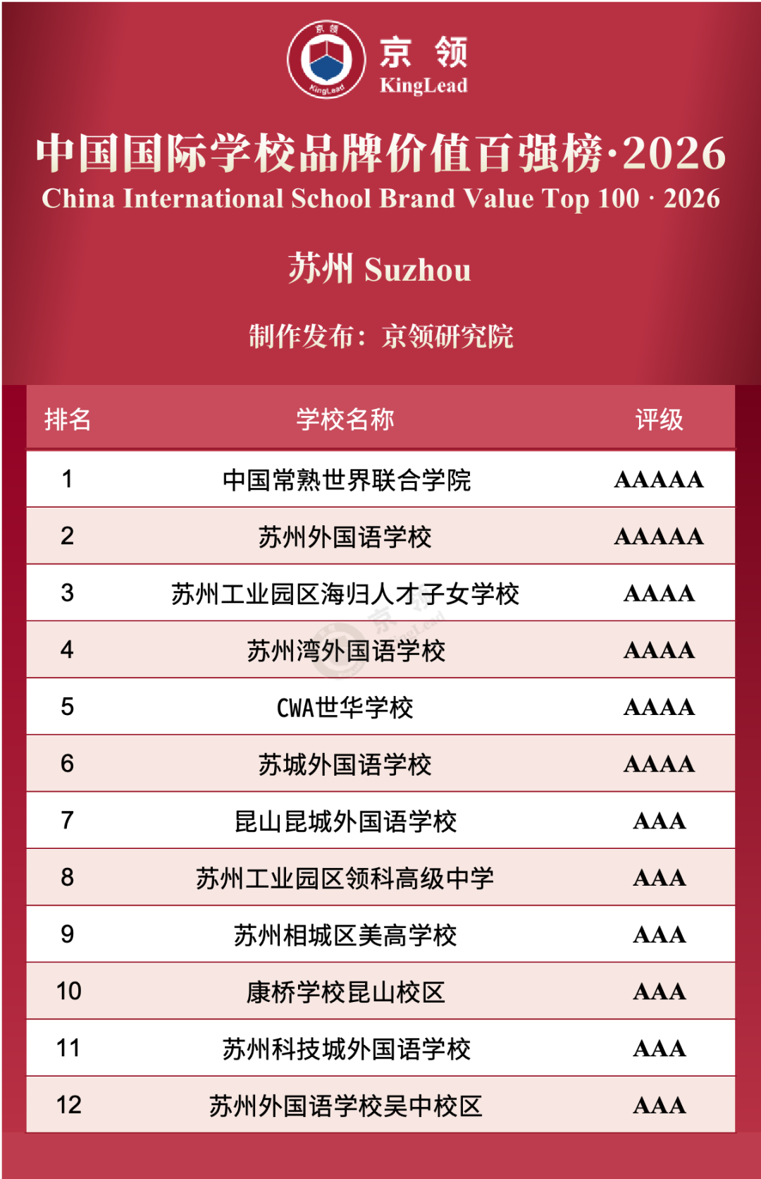 苏州市共有12所国际学校上榜。其中2所学校荣获5A评级,分别为中国常熟世界联合学院、苏州外国语学校。