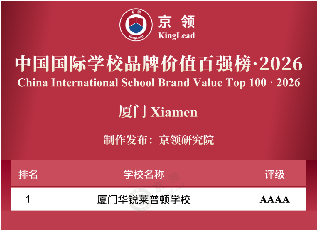 厦门市共有1所国际学校上榜,荣获3A评级,为厦门华锐莱普顿学校。
