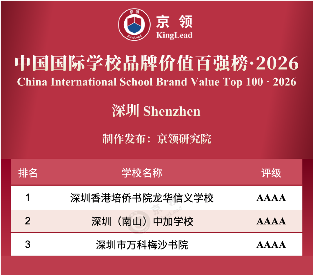 深圳市共有3所国际学校上榜,均荣获4A评级,分别为深圳香港培侨书院龙华信义学校、深圳(南山)中加学校、深圳市万科梅沙书院。