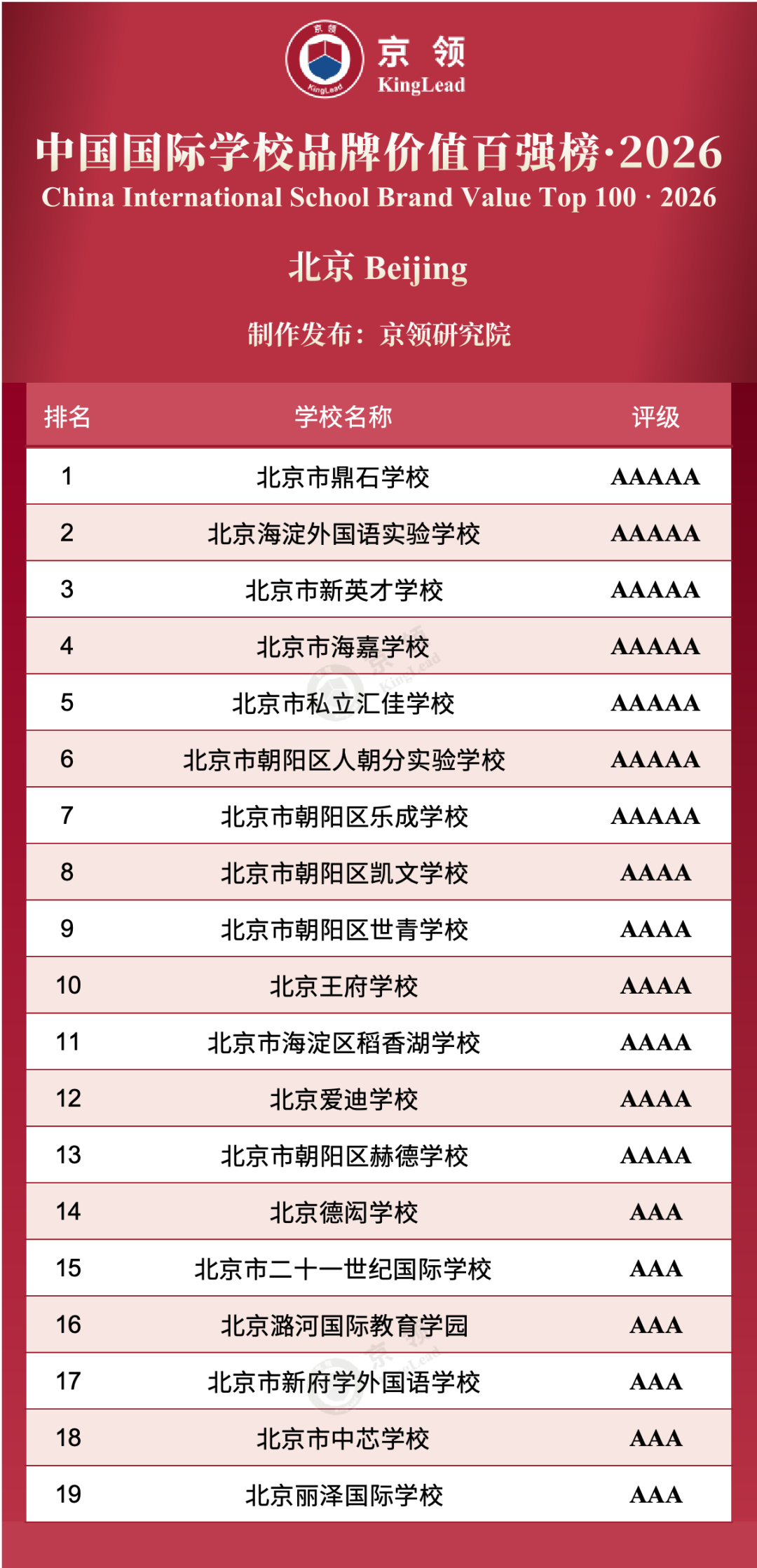 京领中国国际学校品牌价值百强榜在排名的基础上,对国际学校品牌进行评级。其中,排名第1-20名对应“5A”评级,排名第21-50名对应“4A”评级,排名第51-100名对应“3A”评级。