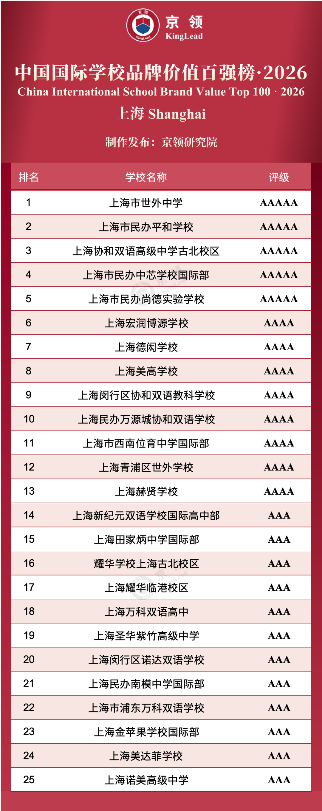 2026年1月15日,京领2026中国国际学校品牌价值百强榜正式发布。今年是京领连续第九年发布中国国际学校系列榜单。当前,世界正经历百年变局与科技浪潮冲击,国际学校已迈入以“高质量发展”为核心的新阶段。今年品牌榜在延续往年评估体系的基础上,增加“可持续经营”一级指标,下设财务稳健性与团队稳定性两个二级指标,旨在挖掘和彰显品牌积淀深厚、办学成绩稳定、品牌建设突出,且具备可持续发展潜力的国际学校,从而进一步推动国际学校品牌建设与高质量发展,促进培养面向未来的创新人才!