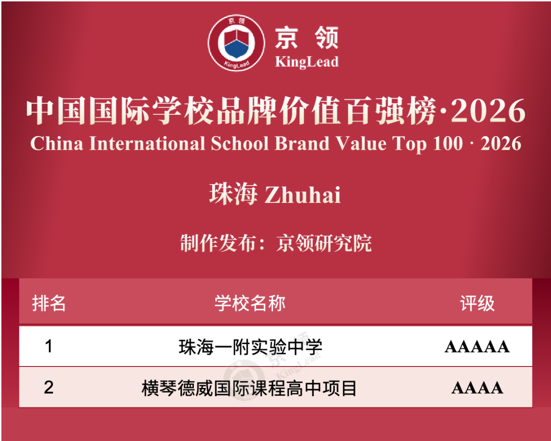 珠海市共有2所国际学校上榜。其中1所学校荣获5A评级,为珠海一附实验中学。1所学校荣获4A评级,为横琴德威国际课程高中项目。