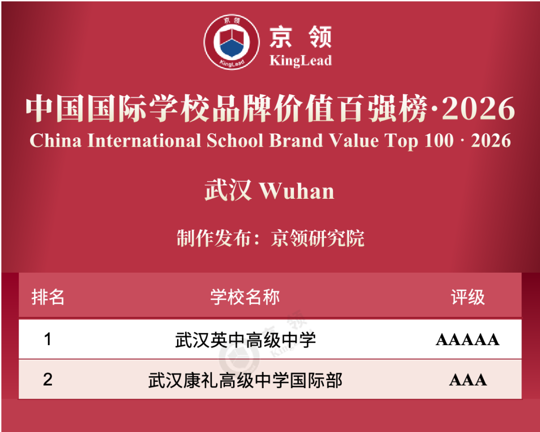 武汉市共有2所国际学校上榜。其中1所学校荣获5A评级,为武汉英中高级中学。1所学校荣获3A评级,为武汉康礼高级中学国际部。