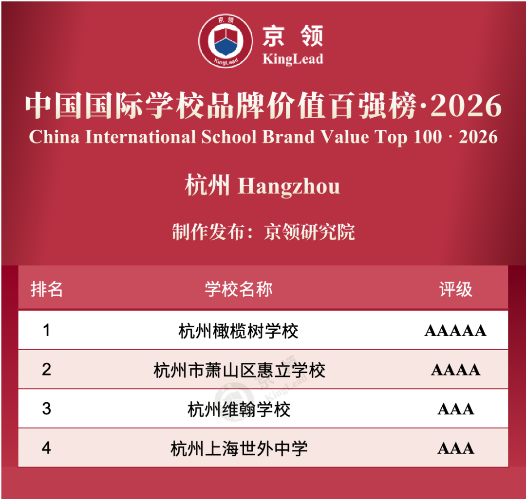 杭州市共有4所国际学校上榜。其中1所学校荣获5A评级,为杭州橄榄树学校。1所学校荣获4A评级,为杭州市萧山区惠立学校。2所学校荣获3A评级,分别为杭州维翰学校、杭州上海世外中学。