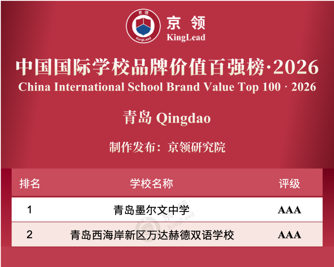 青岛市共有2所国际学校上榜,均荣获3A评级,分别为青岛墨尔文中学、青岛西海岸新区万达赫德双语学校。