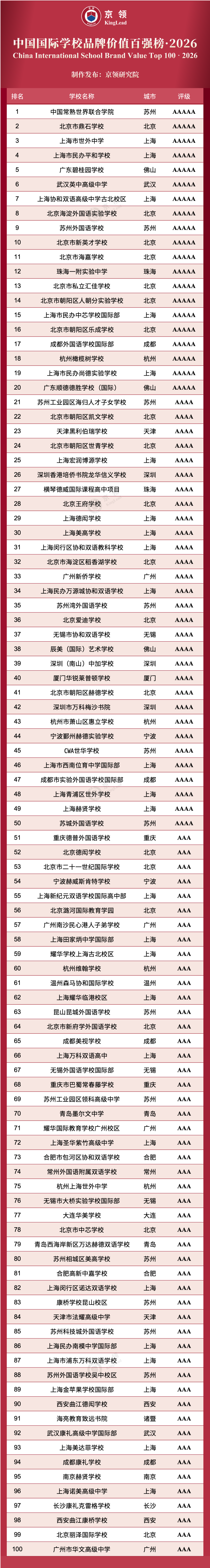 京领中国国际学校品牌价值百强榜以京领国际学校大数据库为基础,结合京领研究院国际化教育领域专家意见,通过实地调研、校长访谈、家长口碑调研与量化评估相结合的方式从认证、师资、社会影响力、可持续经营及行业影响力等方面综合评估国际学校品牌。