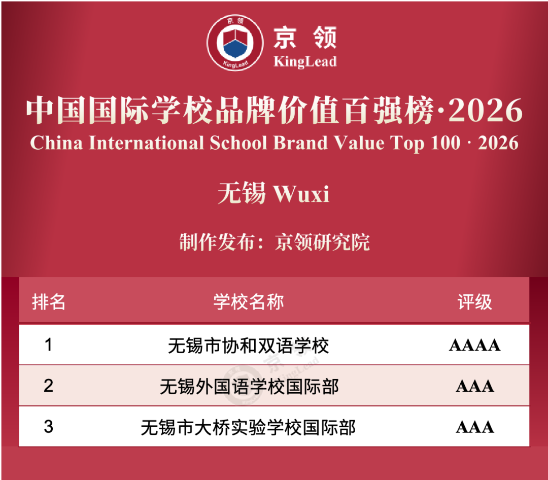 无锡市共有3所国际学校上榜。其中1所学校荣获4A评级,为无锡市协和双语学校。2所荣获3A评级,分别为无锡外国语学校国际部、无锡市大桥实验学校国际部。