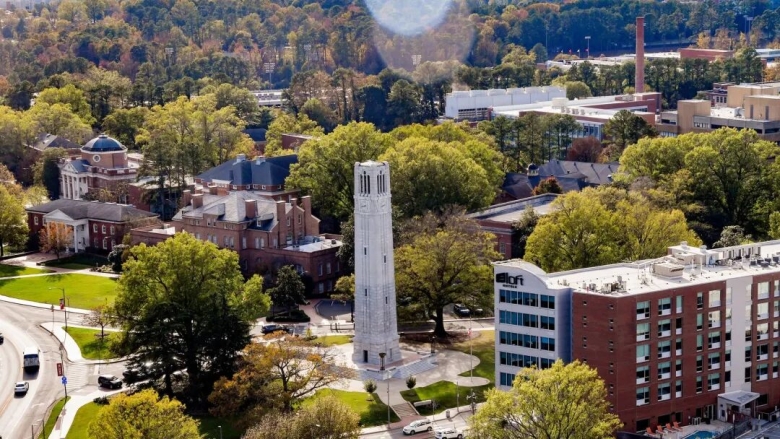 学校基本分为了两个校区,Main Campus 和 Centennial Campus(工程学院及科技公司所在地)。学校位于北卡首府Raleigh,离downtown不远,距离著名的Research Triangle Park也很近,为学生提供了很好的就业和实习机会。学校最有特点的建筑应该就是Hunt Library 了,图书馆利用bookBot自动化图书配送体系,于2013年开始使用。这个系统高效的存储了200万实体藏书,现代化的设计为其赢得了图书馆建筑大奖。位于主校区的Bell Tower也是学校的象征性建筑之一。