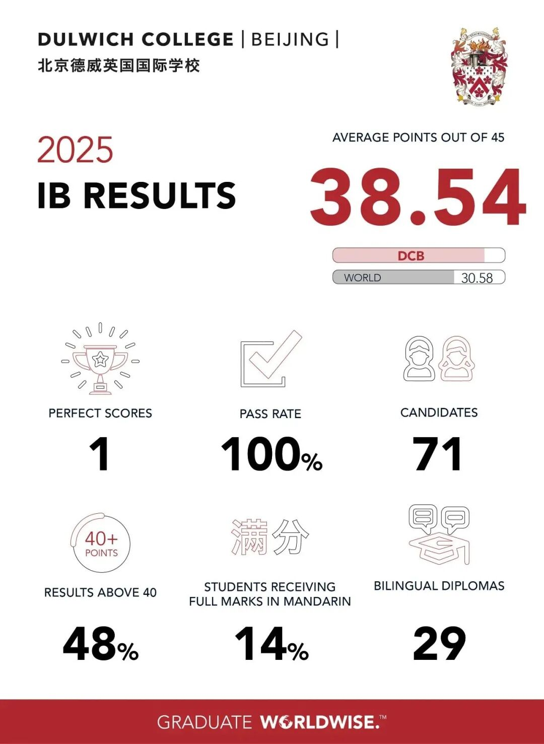 2025届德威71名毕业生在IB大考中取得的优异成绩,IB平均分为38.54分,在全球IB学校统计中位列北京和全国第一!48%的学生(34人)得分在40分以上;14%的学生(10人)在中文考试中斩获满分7分,这一单科满分率或许是德威IB学科中最高的。