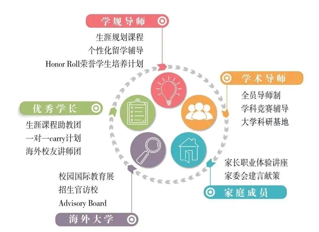 构建由专业学业规划导师、家庭成员、优秀学长、海外大学等组成的协同指导体系,提供一对一升学辅导、学科竞赛辅导、大学科研基地实践等支持,助力学生顺利进入理想大学。