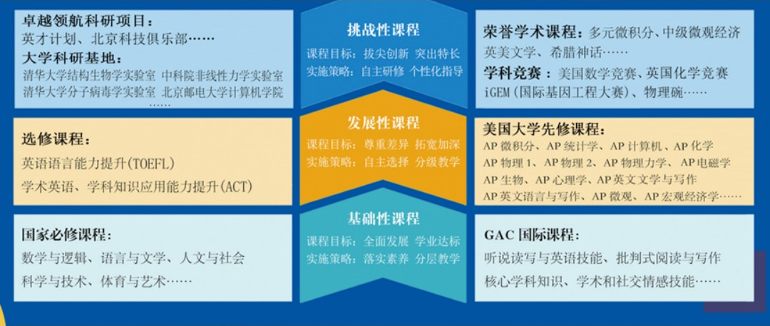 中美高中课程项目学术课程由国家课程、GAC国际课程、备考课程、AP课程、拔尖创新课程组成,突出多样性、实践性和选择性。