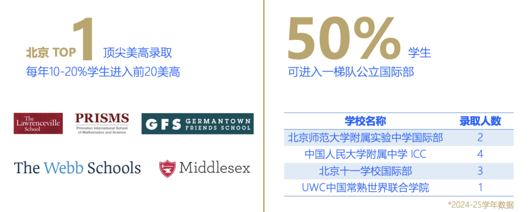 超过50%的国际部初中学生成功获得国内一梯队公立学校国际部的录取。近年来,已有累计30余名学生被北师大实验国际部(2人)、人大附中ICC(6人)、深圳国际交流书院(4人)、UWC等友校录取。