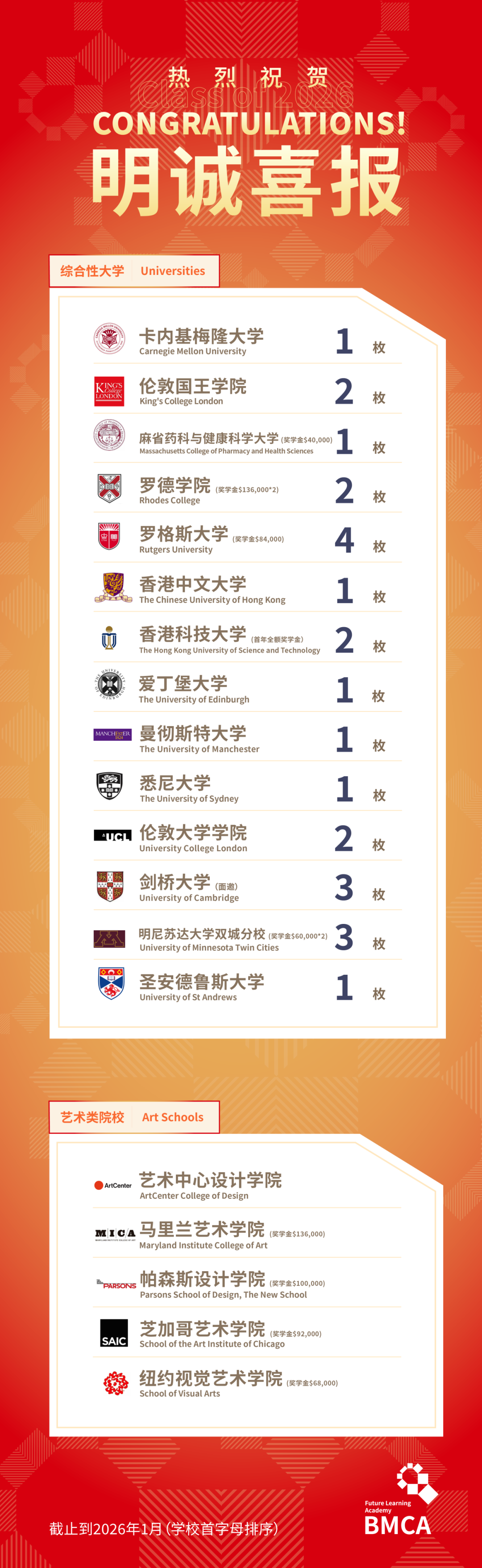 明诚国际部首届毕业生在2026年海外申请中捷报频传,卡内基梅隆大学1枚,香港科技大学全额奖学金(首年)录取2枚,香港中文大学1枚,剑桥大学面邀3枚,伦敦大学学院2枚,伦敦国王学院2枚,爱丁堡大学1枚,曼彻斯特大学1枚,圣安德鲁斯大学1枚,悉尼大学1枚,及超过50w美金的美国名校奖学金录取。