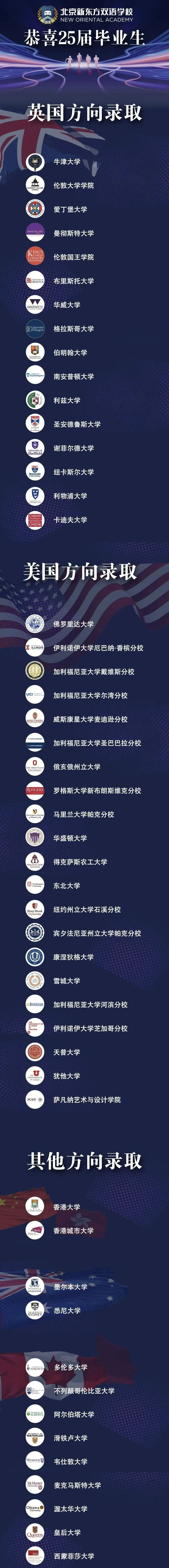 截至2025年4月,北京新东方双语学校学子斩获来自全球排名前百的海外顶尖院校录取,覆盖美国、英国、加拿大、澳大利亚、中国香港等主流留学目的地。核心成果包括: 牛津大学(心理学与哲学,QS全球第3) 伦敦大学学院(教育学/环境科学,QS全球第9) 墨尔本大学(商学,QS全球第13) 香港大学(社会学,QS全球第17) 多伦多大学罗特曼商学院(QS全球第25) 爱丁堡大学(计算机科学,QS全球第27)