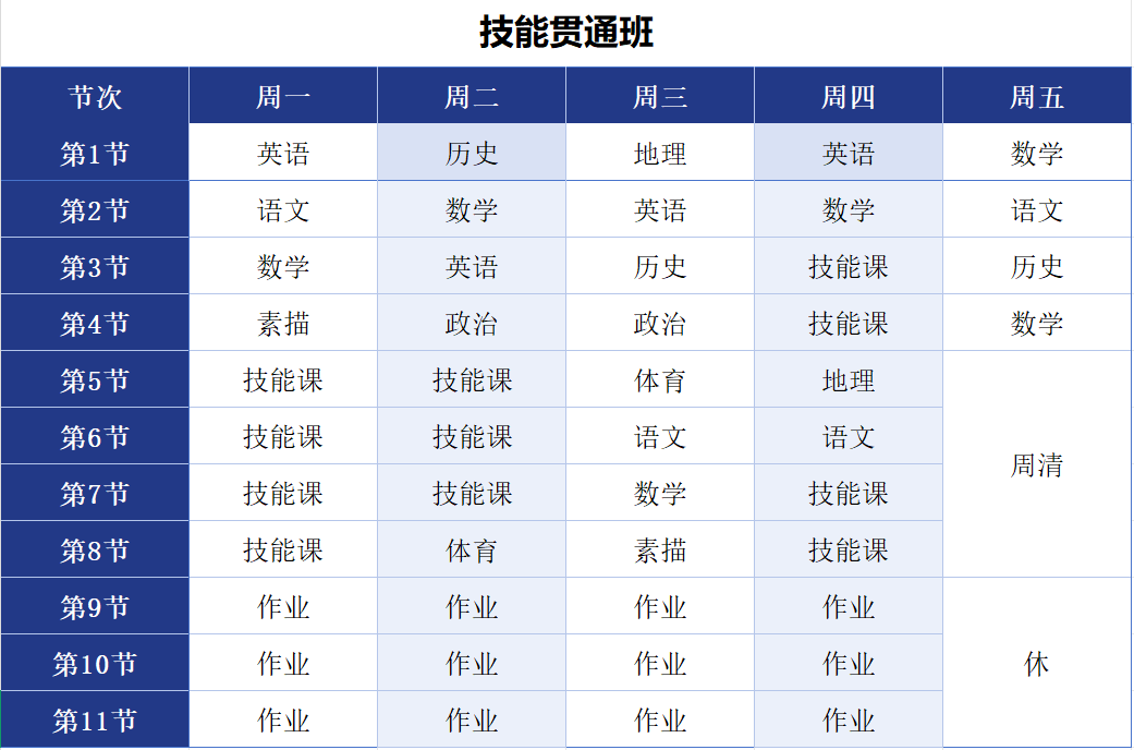 ► 通道二:贯通通道分纯文化和技能两大方向。技能班区别传统应试教育,实践与理论并重,帮助学生掌握实用技能的同时,选择一条最适合自己的就业方向。