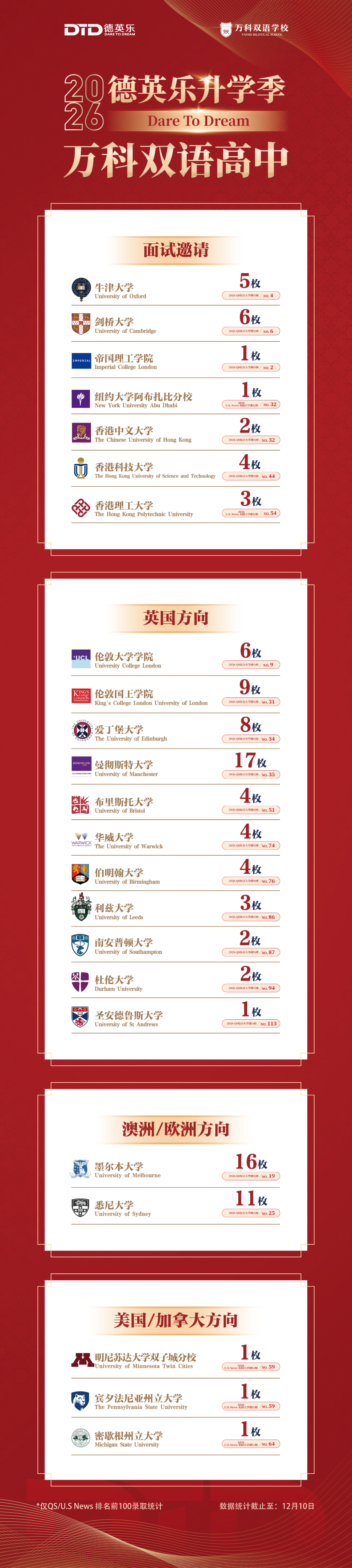 浦东万科高中学子们表现出色。收获多所全球知名大学OFFER。截止至12月10日,65名准毕业生已收到百余封含面邀的全球高校录取,国家地区涵盖英、美、中国香港地区、澳、欧洲等地区: 伦敦大学学院 | 6枚 伦敦国王学院 | 9枚
