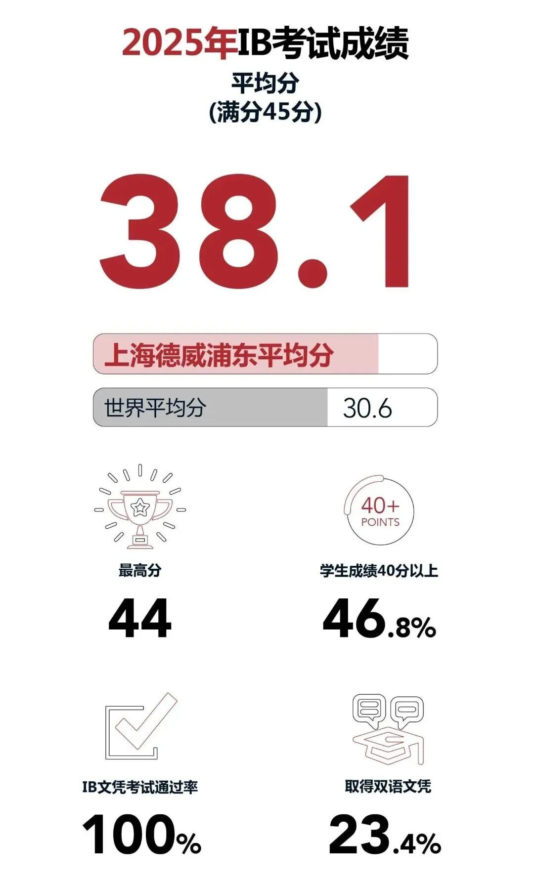 2025年,学生取得了38.1分的平均成绩。47%的考生获得了40分以上的高分。 2024年,IB平均分为37.5。有30%的学生获得了含金量颇高的双语文凭。 2023 年,学生的平均成绩为 38.0 分,其中,一名学生获得了满分45分,是全球不到 200 名满分获得者之一。