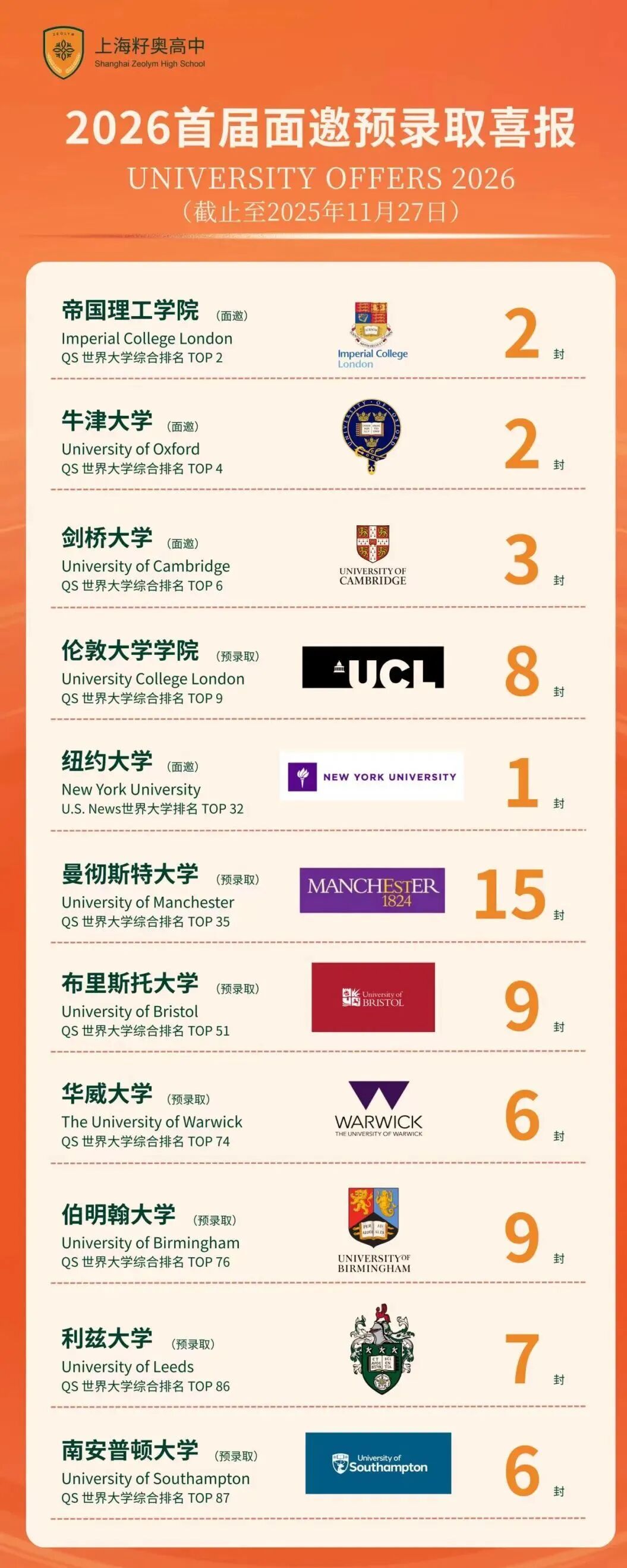 上海籽奥高中学子在海外顶尖名校申请中持续突破,剑桥大学、帝国理工学院、伦敦大学学院(UCL)等世界名校的面试邀请与预录取Offer接连而至。