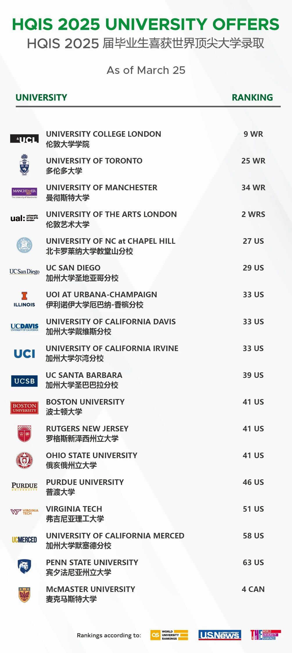 HQIS的毕业生足迹遍布全球顶尖学府,收获了包括QS世界排名Top 50的不列颠哥伦比亚大学、清华大学、纽约大学、香港科技大学、悉尼大学;全美Top 50的范登堡大学、埃默里大学、波士顿大学、南加利福尼亚大学、加州大学尔湾分校、加州大学戴维斯分校等;世界排名Top 1的顶尖音乐学府英国皇家音乐学院;世界Top10的顶尖艺术院校芝加哥艺术学院的录取通知书。
