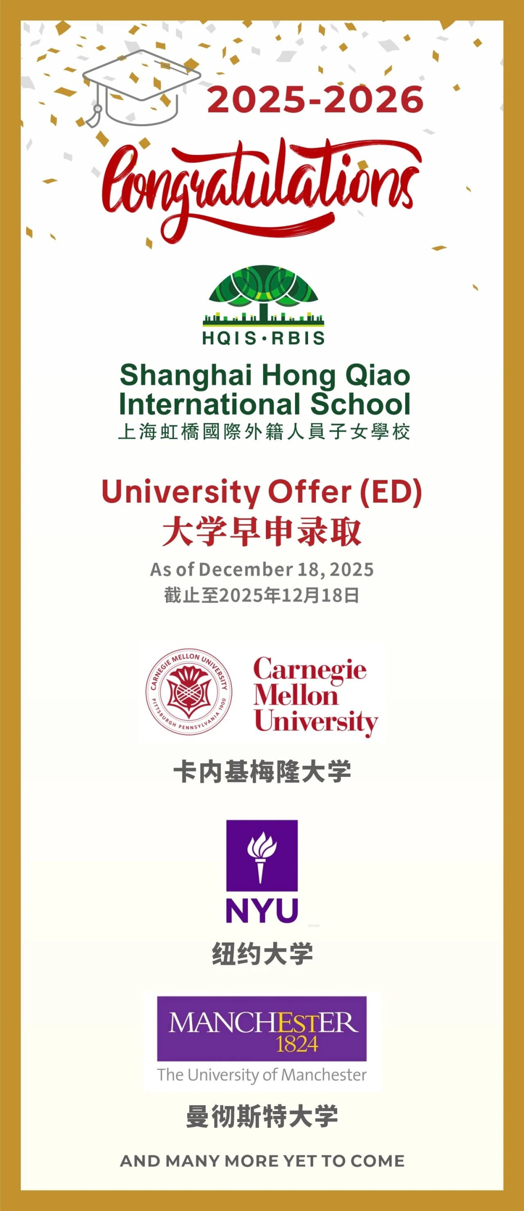 上海虹桥国际外籍人员子女学校(HQIS)12年级毕业生凭借杰出的实力,截止至12月18日,成功获得了世界顶尖学府的早申录取:卡内基梅隆大学(2025年QS世界排名第58位)纽约大学(2025年QS世界排名第43位)曼彻斯特大学(2025年QS世界排名第32位)。