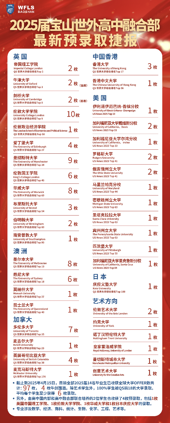 2025届14名毕业生已收获全球大学offer数共计97枚,4枚牛剑面邀。除艺术学生外,100%学生被QS前18的你大学录取。平均每个学生至少获得6枚录取。专业涉及数学、经济、商科、统计、生物、化学、工程、艺术等。 另外,由高中国内部和高中融合部联合培养的2位学生也收获了4枚预录取,包括1枚帝国理工学院,1枚伦敦大学学院、1枚华威大学和1枚日本庆应大学的录取。