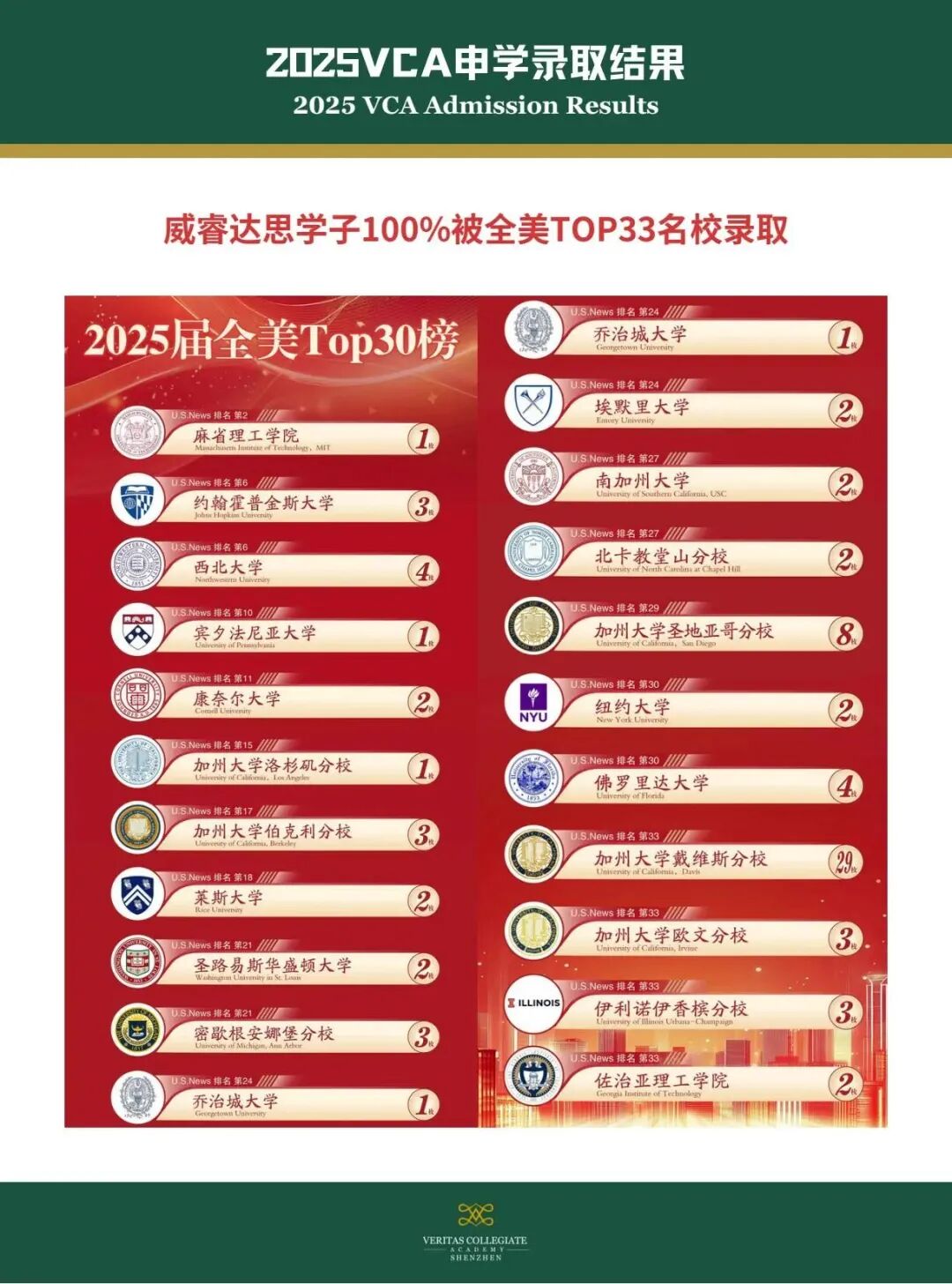 2025年,威睿达思毕业生100%进入了美国前33学校,95%进入了美国前24学校,56%进入了美国前20学校,29%进入了藤校+前十!有7名同学分别进入了世界顶尖大学麻省理工学院、约翰霍普金斯大学、西北大学等。