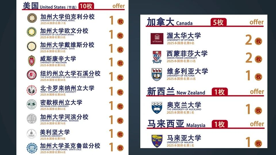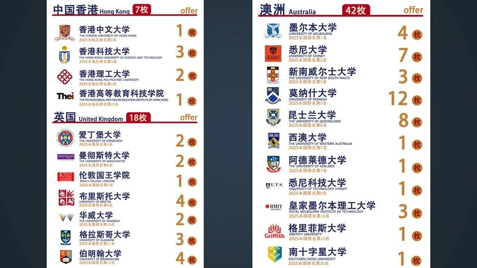 英国方向:牛津大学、剑桥大学、帝国理工大学、伦敦大学学院、伦敦政治经济学院、爱丁堡大学、伦敦国王学院、杜伦大学、华威大学、伯明翰大学、曼彻斯特大学、布里斯托大学 美国方向:芝加哥大学、加州大学洛杉矶分校、加州大学戴维斯分校、加州大学欧文分校、纽约大学、西北大学、东北大学、乔治华盛顿大学 加拿大方向:麦吉尔大学、多伦多大学、不列颠哥伦比亚大学 澳大利亚方向:澳大利亚国立大学、悉尼大学、墨尔本大学 新加坡方向:新加坡国立大学、南洋理工大学 中国香港方向:香港大学、香港中文大学、香港科技大学、香港理工大学、香港城市大学