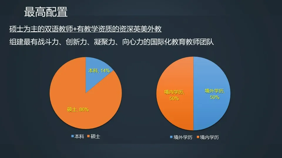 外教团队主要由来自英美的教学经验丰富、持有TEFL或TESOL教学资质的外籍教师组成。 中教团队成员均为具备双语教学能力、精通国际化教育理念、拥有成熟国际化教学经验、获得CAIE(剑桥大学国际考试委员会)授权国际课程教学资质的中籍教师。
