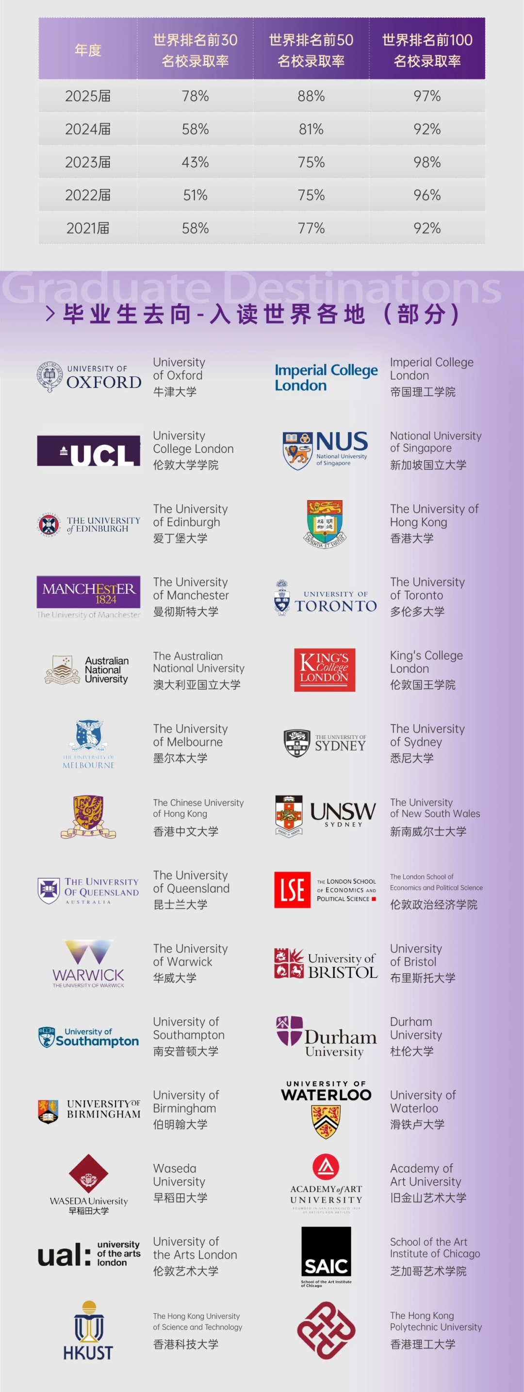 2025届学子一举拿下剑桥大学与牛津大学面试邀请; 多名学子成功斩获香港大学录取并收获全额奖学金; 本届毕业生收获伦敦大学学院、爱丁堡大学、曼彻斯特大学、伦敦政治经济学院等名校多封录取OFFER; FBAS艺术部毕业生,也同样以优异的成绩,成功开伦敦艺术大学、芝加哥艺术学院等众多优质艺术类名校的大门。 TOP前10录取率31%,TOP前30录取率78%,TOP前50录取率88%,TOP前100录取率97%。