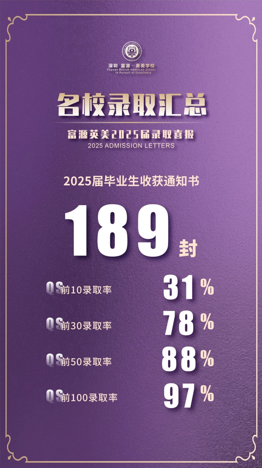 作为办校23年,拥有17届优秀毕业生的老牌国际学校,富源2025届毕业生也取得不错成绩,截止6月6日,富源英美2025届毕业生收获通知书185封,TOP前10录取率 31%,TOP前30录取率 78%,TOP前50录取率 88%,TOP前100录取率 97%。