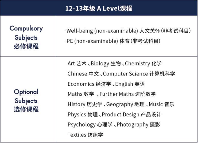 Years 12/13开设A Level课程,A-level课程因其学术专业性、灵活性,以及精准衔接大学高等教育,是全球公认的大学入学资格考试。升读12年级的学生必须选修3-4科。
