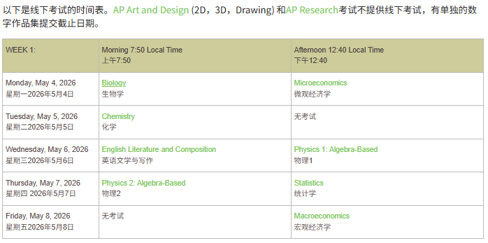 1、2026年AP考试将在5月4日-8日和5月11日-15日两周内以线下考试形式进行。