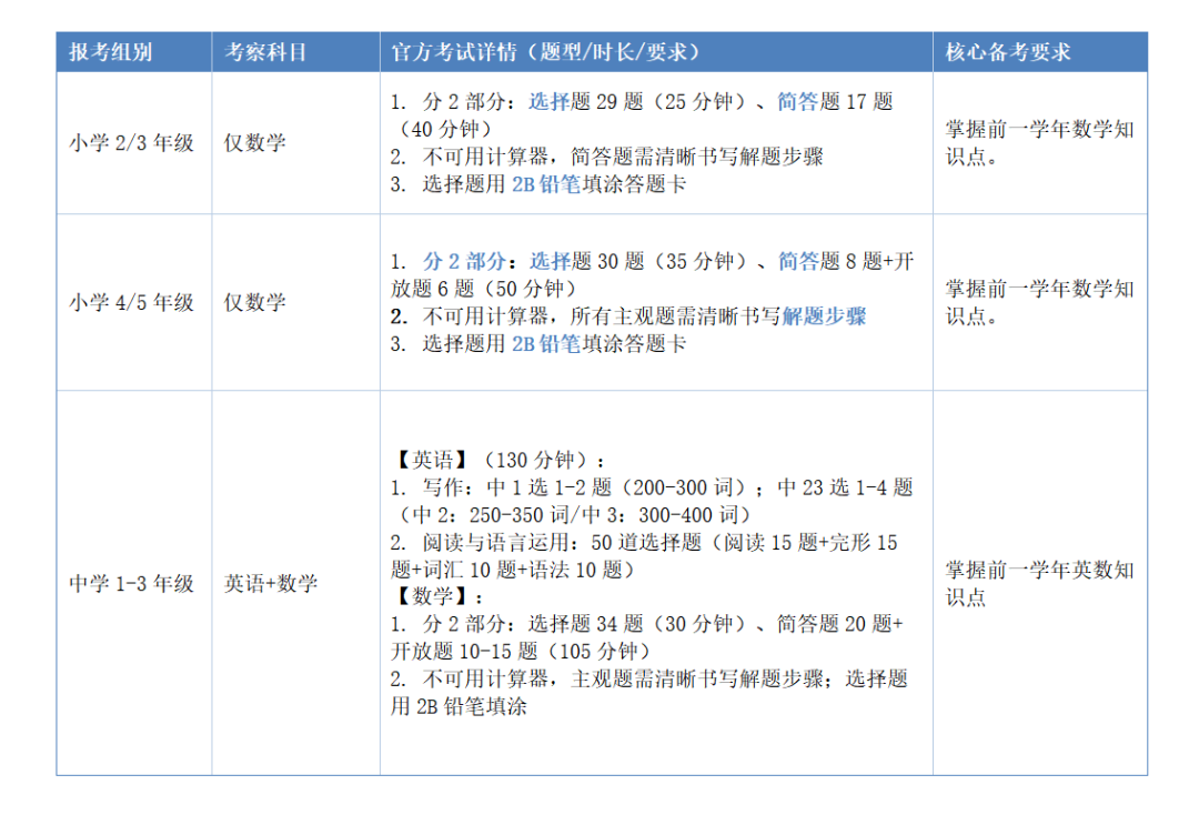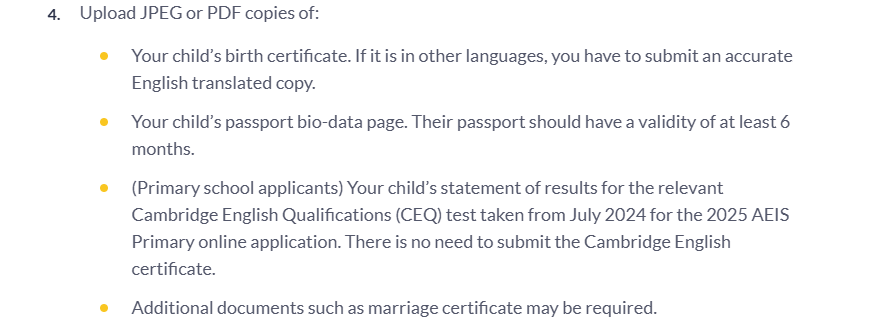 小学2-5年级、中学1-3年级 关键时间节点 2026年9-10月组织入学考试,2027年1月正式入学 核心准入门槛 小学阶段申请者需提前取得剑桥英语资格(CEQ)并达到最低分数线,中学阶段无前置英语考试要求 录取以AEIS考试成绩为核心评判标准,结合新加坡政府学校学位空缺情况综合评定。如果想要了解更多细节或在申请中遇到问题可添加客服微信kewo12,我们提供申请辅助服务。 需通过新加坡教育部官方年龄核查工具(Age Checker) 精准核验,明确学生对应的考试级别与可申请年级,确保年龄与申请年级完全匹配,从源头避免因年龄不符导致申请无效。 小学申请者英语能力要求 仅小学阶段申请者需满足英语达标条件:须在2025 年 7 月及以后参加剑桥英语资格(CEQ)考试,并取得官方要求的最低合格分数线;申请时仅需上传成绩单扫描件,无需提交纸质证书。 特殊情况申请须知 若学生曾就读新加坡政府学校、需重新申请入学,需先结清此前所有学费欠款,再提交专用评估表格完成入学资格前置评估,审核通过后方可参与本次 AEIS 申请。 重点提醒 CEQ 成绩单是小学 AEIS 申请的硬性准入材料,无有效成绩单将无法完成申请提交。建议家长提前规划孩子的 CEQ 备考与考试时间,预留充足准备周期,避免耽误申请进度。 家长需通过新加坡教育部考生门户(Candidates Portal,简称 CP),为学生注册专属考生账户。可参照 AEIS CP 官方用户指南规范操作,务必确保所有信息填写精准无误,避免因信息错误影响后续审核。 申请材料上传 材料需严格按照官方要求准备并上传,确保规范有效。 格式要求 统一为 JPEG/PDF 格式 翻译要求 非英文材料需附带官方认可的英文翻译件;必备材料:学生出生证明、学生护照信息页(有效期不少于 6 个月)、护照规格证件照(尺寸 410×514px,格式 JPEG/PNG) 小学申请者 同步上传 CEQ 成绩单以及新加坡教育部要求的其他补充材料(如监护人结婚证等)所有材料须保证真实、完整、符合官方规格。 申请费用缴纳 AEIS 申请费用为不可退款项(含商品及服务税 GST),支持信用卡、借记卡、PayNow 三种支付方式,收费标准: 小学阶段:340 新元 中学阶段:630 新元 申请提交与凭证留存 完成材料上传及费用缴纳后,请逐项核对所有信息与材料,确认无误后在考生门户(CP)正式提交申请。提交后请妥善留存申请记录及缴费凭证,以备后续核查使用。 审核通过且费用缴清后,监护人会收到官方邮件通知,请及时登录CP下载《准入证明》(Entry Proof)。该证明包含考试地点、报到时间、考生信息等核心内容,是参加AEIS考试的唯一必备凭证,无此证明将无法进入考场。 重点提示 申请状态以CP系统显示为准,无需通过邮件咨询审核进度,避免无效沟通。 小学阶段仅考数学;中学阶段考英语+数学。备考内容为目标就读年级的前一级别(例如申请小学3年级,需备考小学2年级内容)。 重点提示 考试当日请严守考场规则。 必备材料 学生护照信息页复印件和《准入证明》复印件,两者缺一不可。 准时到场 请按《准入证明》标注的报到时间准时到场,开考前至少15分钟完成入场就座,千万别迟到错过考试。 仅可携带2B铅笔(用于填涂机读卡),严禁携带计算器及其他辅助工具,违规将按考场规定处理。 来源:课窝教育PART 01 AEIS考试核心信息速览