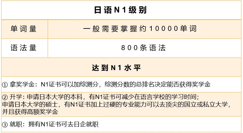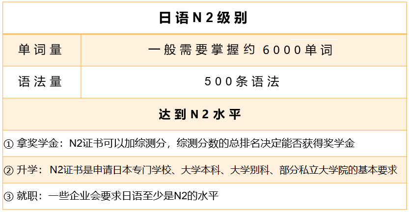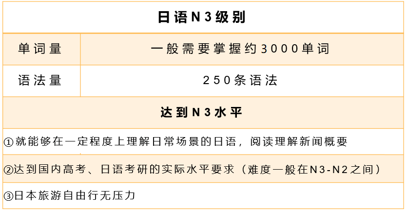 日本语能力测试(JLPT)是对日本国内及海外以母语非日语学习者为对象,进行日语能力测试和认定。是目前认可度最高的一门日语考试。JLPT分为N1、N2、N3、N4、N5共5个级别,其中N1级别最高,N5级别最低。 N3考试是国际日本语能力测试2010年改革后推出的中级别的考试,日语N3级基本对应《标日》中级上的水平,具备了日语N3考试水平者将可以参加自学考试。 经常有同学提问:日语n3是什么水平?到底有没有必要考? 为了回答这个问题,先说一说JLPT各等级之间到底差距在哪里。 N1 各种场合的沟通 N2 日常沟通 N3 沟通基础 N4+N5 初级入门 下面是具体每个级别大概是什么水平,都能做什么。 能够无字幕无压力看懂动漫日剧,原版小说等。 能满足工作、社会交往、大学学习及基础研究的需要。 也就是说,用日语作为工作语言,或是留学读研,或早或晚都要达到这个水平以上。 N1证书含金量高,是赴日留学、日企求职的有力保障。 (如:申请国/公立大学院生,要求N1合格证书) 教材对应新版《标准日本语》初/中/高级 6册全套。 N2水平能够理解日常使用的日语,并一定程度上理解范围更广的各类话题。 也就是达到大家最关心的“日常交流水平”。 能够无字幕看懂动漫日剧等。 N2水平达到部分理工类学科的留学标准,申请日本院校(非语言学校),一般至少需要N2水平。 N2证书可以说是赴日学习、工作的敲门砖。 教材对应新版《标准日本语》初级上下册+中级上下册。 具有一定日常会话和读写的能力。想要更流畅地运用日语,至少要达到这个水平。 教材对应新版《标准日本语》初级上下册+中级上册。 能够进行简单的对话及读写浅易短小的文章。能够理解基本的日语。 教材对应新版《标准日本语》初级上下册。 熟练掌握五十音图,能够掌握一定日常会话。 N4、N5属于日语初级体系,算是日语入门,证书的含金量很低,可以作为兴趣学习来学。 教材对应新版《标准日本语》初级上册。 回到标题:N1和N3的差距有多大? 先对比一下词汇量,以下是各等级参考的词汇量: N5水平,100个汉字,800个单词。 N4水平,300个汉字,1500个单词。 N3水平,600个汉字,3000个单词。 N2水平,1000个汉字,6000个单词。 N1水平,2000个汉字,10000个单词。 比较熟悉日语考级的同学应该知道,经典的《新标日》教材基本是一本书一个等级,但N2→N1,向上一个级别,就需要高级上下册两本。 0到N3是前3本,0到N1就要全套6本了。 这个差距不止在词汇量或是三本教材上面。 JLPT考试N2是一个台阶,N1是一个台阶; 从N2到N1,以及从N3到N2都需要过硬的基础,以及针对考试进行系统的备考冲刺。 这里需要强调的一点是,自己到底应该学到什么程度要和你的需求匹配。如果对日语证书没有需求,仅仅是做一个兴趣了解,那么学到N3左右就差不多了,就已经可以应用日语去查资料、了解一般信息了,也有不少的字典及应用工具去帮助你了解你想知道的日语内容。 但是如果想要流利掌握日语,之后要考研、出国留学、或找日语相关工作,至少要往N2上走。 如果说学到N3就可以正常走路了,那么达到N1的你是具备跑跳能力的——不止能跑跳,想要跨栏,想要爬楼,想要翻跟头这些通过学习吸收都不是问题。 N3是一个中等的水平了,在五个等级考试中是最中间的,考试的难度也不是特别大,但是想要达到这个水平也不是那么简单的。N5和N4比较简单,考这两个等级也会比较容易,但是N3的难度也就上来了,它要求学生要能读懂较难一点的文章以及评论等。 对于N3有没有必要考这个问题,其实没有准确的答案,只能说仁者见仁智者见智,但小编还是建议大家可以参与N3的考试,原因有以下2点: ① 就考级而言,N3其实是N2的一个过度,是学好N2的基础。日语能力测试的等级划分是包含与被包含的关系,如果要是想要顺利通过N2的考试,N3是一定要顺利通过的。 如果对于没有参加过日语能力测试考试的同学,直接报考N2可能不了解考试的流程,所以多少会有一些紧张,如果要是在前期进行N3考试后,一方面了解了考试的流程,可以放松心态,另一方面可以通过N3考试的成绩给自己吃下一颗定心丸。 ② 就工作而言,有些日企比较注语言基本功的建设,可能会有一部分日企会要求在你拿下N3等级后才可以参加N2的考试。入门虽简单,中期很困难,学精绝不易。学语言,谁不是往死里背和记,任何人都别想投机取巧。如果觉得N2学习很吃力,可以通过N3考试过渡一下,看看自己真实的水平。 当然,最终要不要报考,还是根据自身实际情况进行选择。N1-N5各等级能力差别