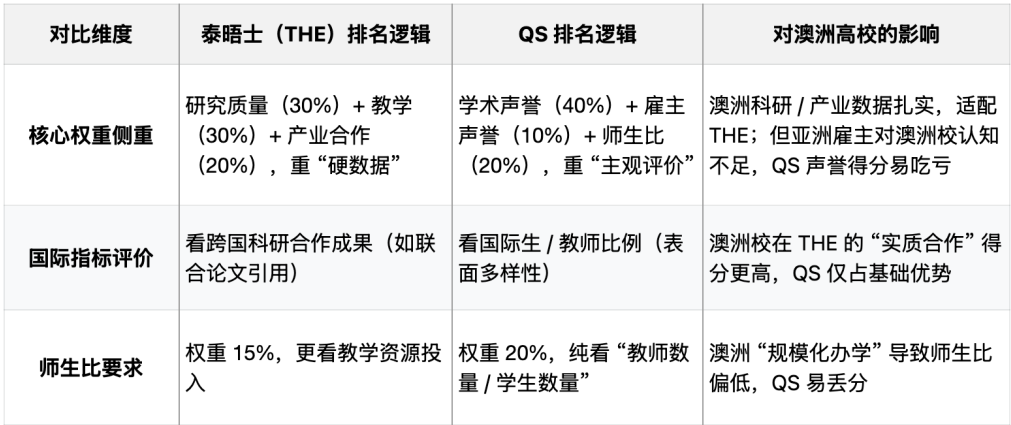 很多人疑惑,澳洲高校的 THE 排名为何能稳步上升?又为何会与 QS 排名出现 “不同步”?答案藏在两大榜单的评价体系里,这两点关键差异必须理清:
