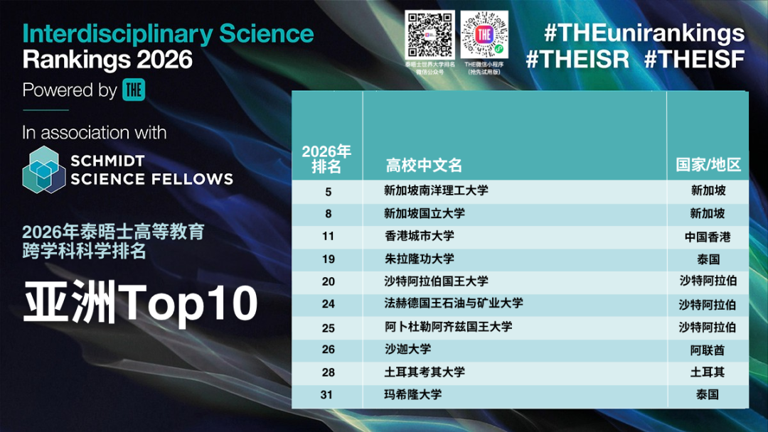 2026年泰晤士高等教育跨学科科学排名(ISR)正式揭晓,美国高校再度占据榜首。亚洲共有486所高校上榜,占榜单总数逾半,成为代表性最强的洲际。 本篇将带来亚洲高校分析。