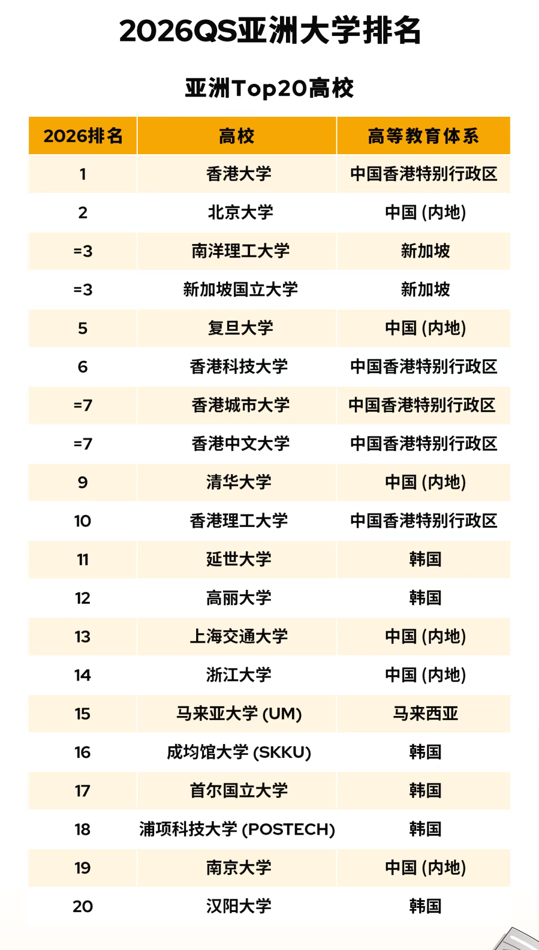 QS于发布了2026QS亚洲大学排名。 香港大学荣登亚洲榜首,北京大学位居第二。 中国(内地)、中国香港特别行政区和新加坡的高校包揽了亚洲排名前十位。北京拥有40所上榜院校,成为亚洲上榜院校数量最多的城市,上海以22所高校上榜位列第五,西安和南京分别拥有18所和17所上榜院校。 在2026QS亚洲大学排名中,哈萨克斯坦共有3所院校进入TOP100,分别是哈萨克国立大学、国立欧亚大学和萨特巴耶夫大学; 哈萨克国立大学排名略有下降,但依旧是哈萨克斯坦排名第一的院校; 国立欧亚大学排名第61名,相比较去年上升了4位; 萨特巴耶夫大学由89名跃升至79名,在排名中上升了10位;