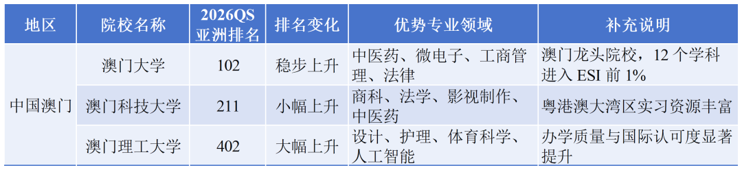 最亮眼的是澳门理工大学,从去年排名大幅跃升至亚洲 402 位,办学质量和国际认可度提升明显,它的设计、护理、体育相关专业性价比不错;