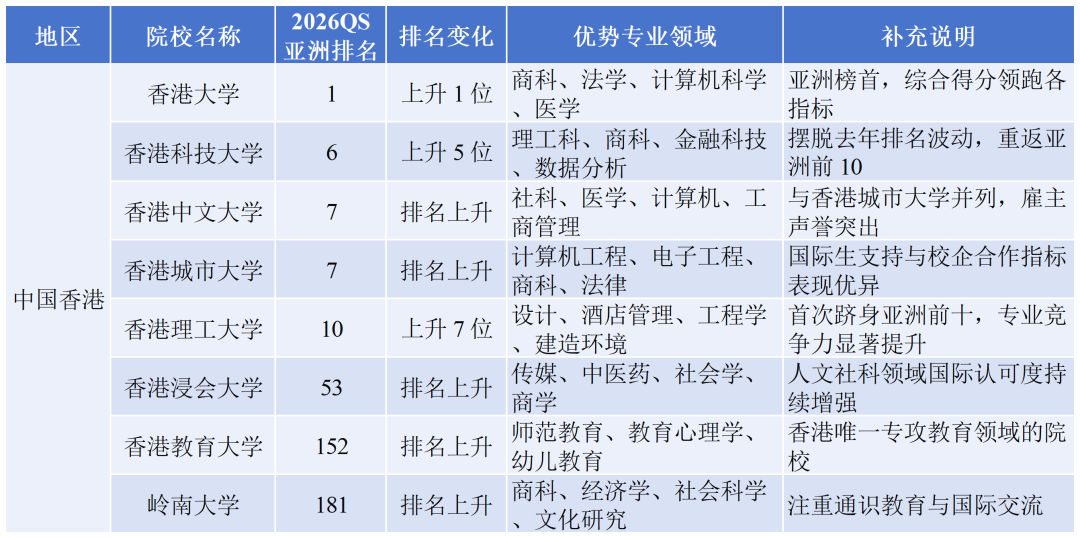 11 所上榜院校里 9 所排名上升,香港大学毫无悬念拿下亚洲第 1,学术声誉、雇主合作、国际生服务全维度在线,商科、法学、计算机这些热门专业,今年申请热度只会更高;