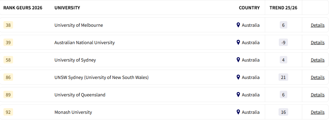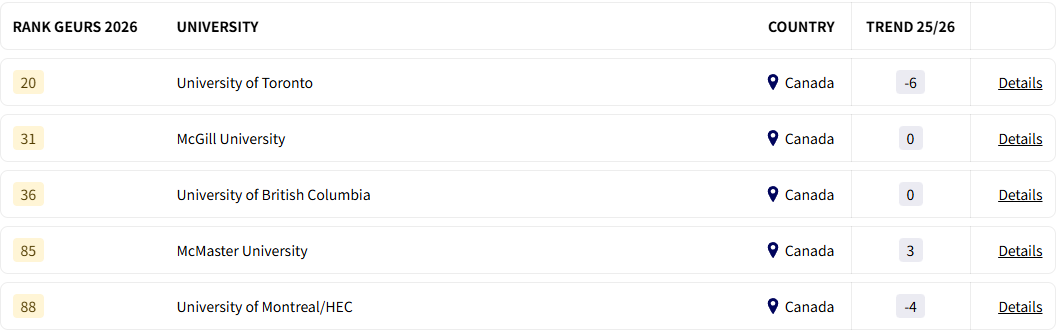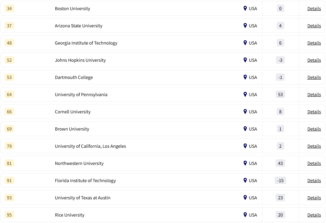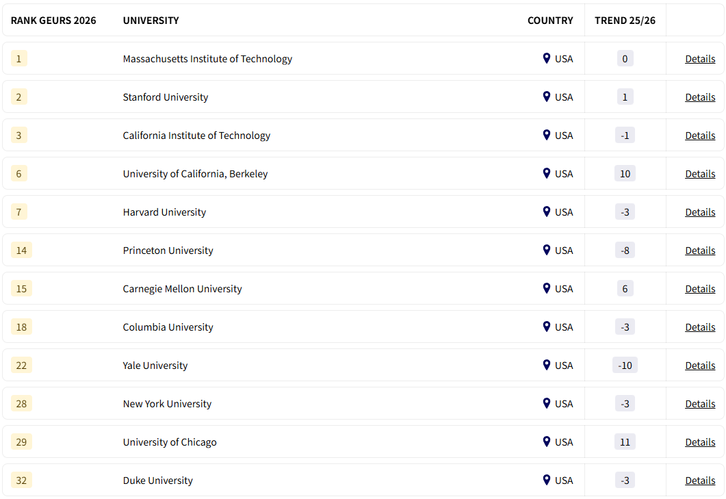 加州大学伯克利分校(第6)、哈佛大学(第7)、卡内基梅隆大学(第15)等院校均跻身全球前20,覆盖了理工、综合、商科、计算机等多个领域,说明美国在不同学科方向的顶尖院校都具备极强的就业力,能为学生提供多元化的职场竞争力。