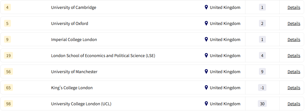 英国3所G5高校上榜,剑桥大学世界第4,牛津大学世界第5,帝国理工学院世界第9。